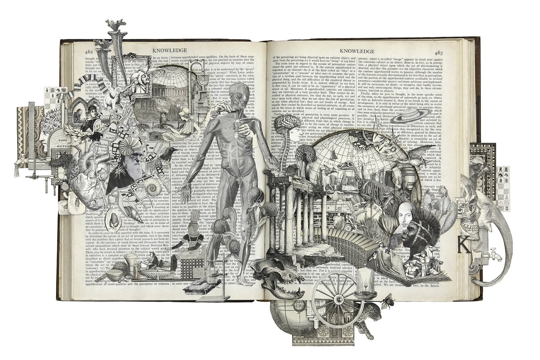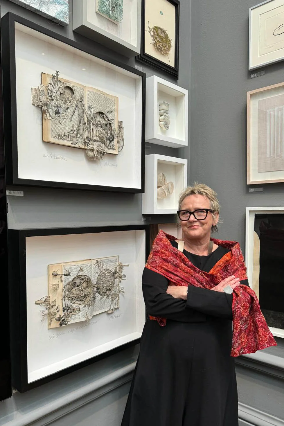 Collage artist working into old books with found ephemera. Exhibiting internationally, she's been selected twice for the RA Summer Exhibition.
