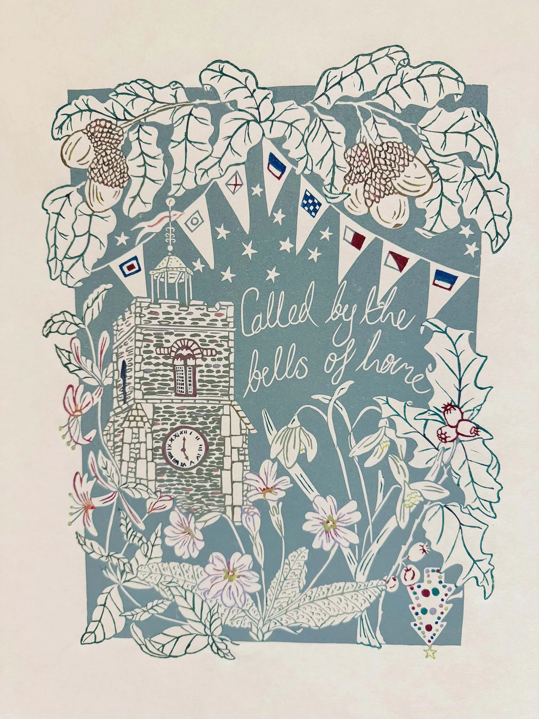 Symbolic botanicals and Katie's poetry intertwine, creating a quiet, calm space for reflection through evocative, hand painted lino prints.