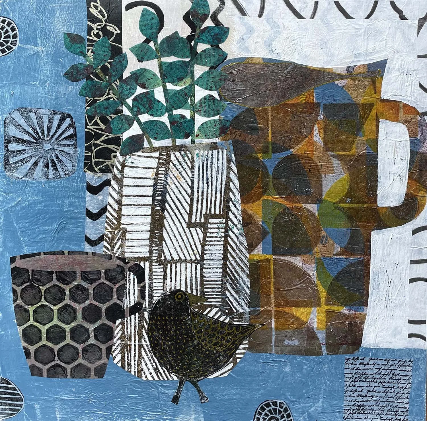 I make collages using hand printed tissue paper. I also use the printed tissue paper to make unique earrings. I have a range of greetings cards, coasters, placemats, magnets and tea towels featuring images of my work.